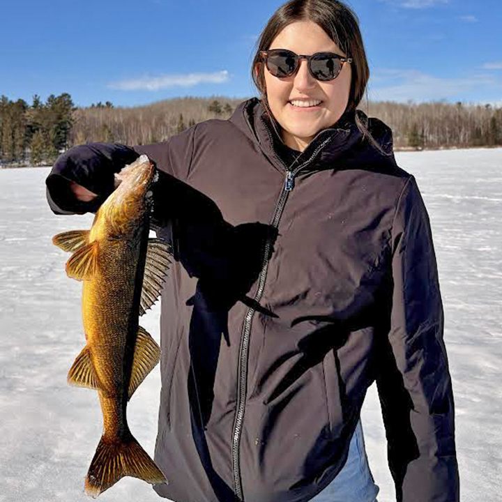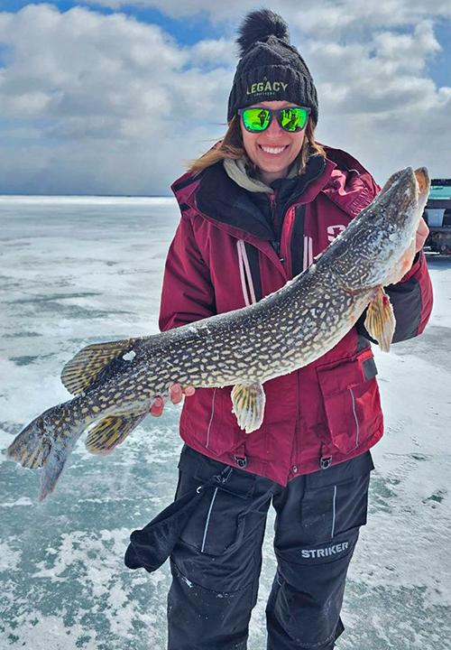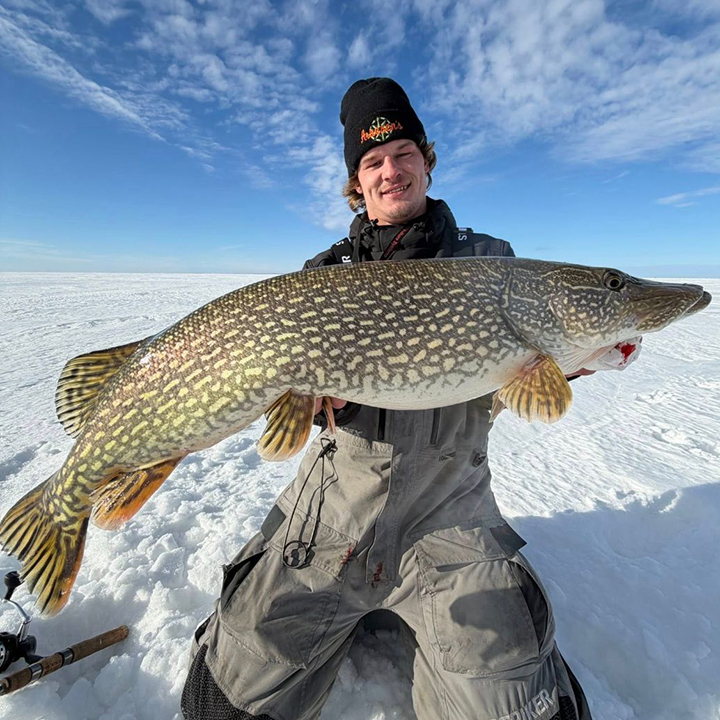 image of ice fisherman holding huge northern pike caught near Ely Minnesota