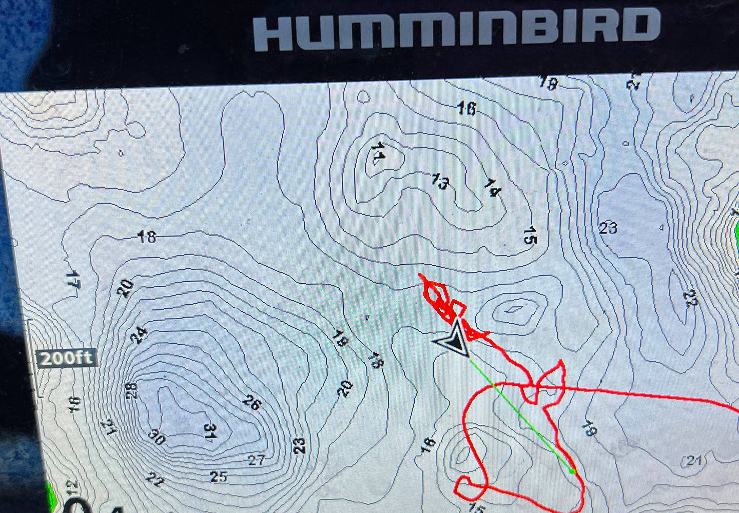The screen image of my chart (enlarge) shows the nomenclature of the area where we eventually found fish. A mid-lake hole, surrounded by shallow water featuring a series of weedy bars, along with the flat of sparse weeds. You can see by my plotter trail that I never bothered looking over the deep hole. I was actually headed toward it, but as I crossed the weedy flat, fish began appearing on the screen of my graph. As the screen image of my graph also reveals, it’s getting late and Susan, who has been waiting for some fish to catch for a couple of hours, caught a glimpse of the screen. Sighting the fish on it, she said, “Can you see all those fish, let’s get going and catch some!”